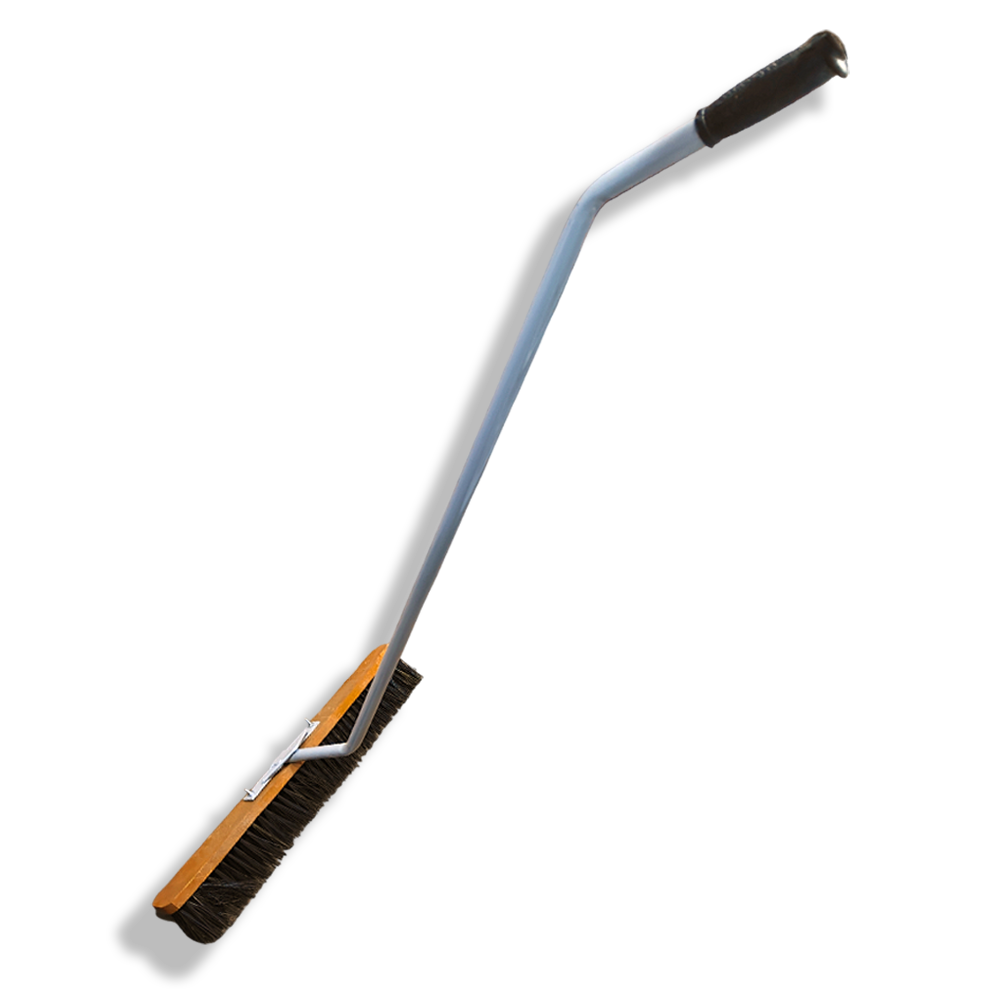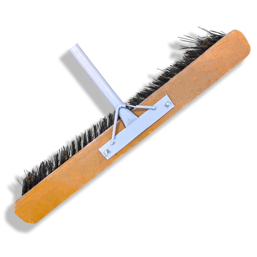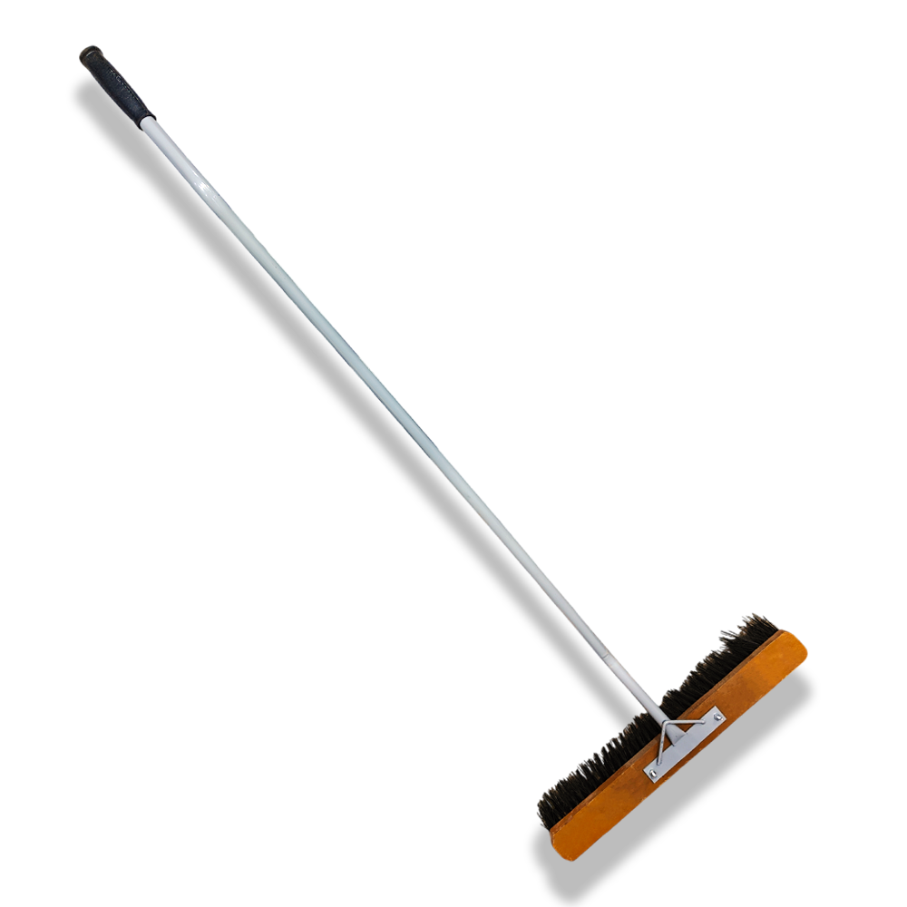 - تصميم مدعم : الكف الخشبي متصل بالذراع عبر دعامة معدنية قوية (Bracing) لضمان عدم اهتزاز أو كسر المكنسة أثناء الدفع القوي.