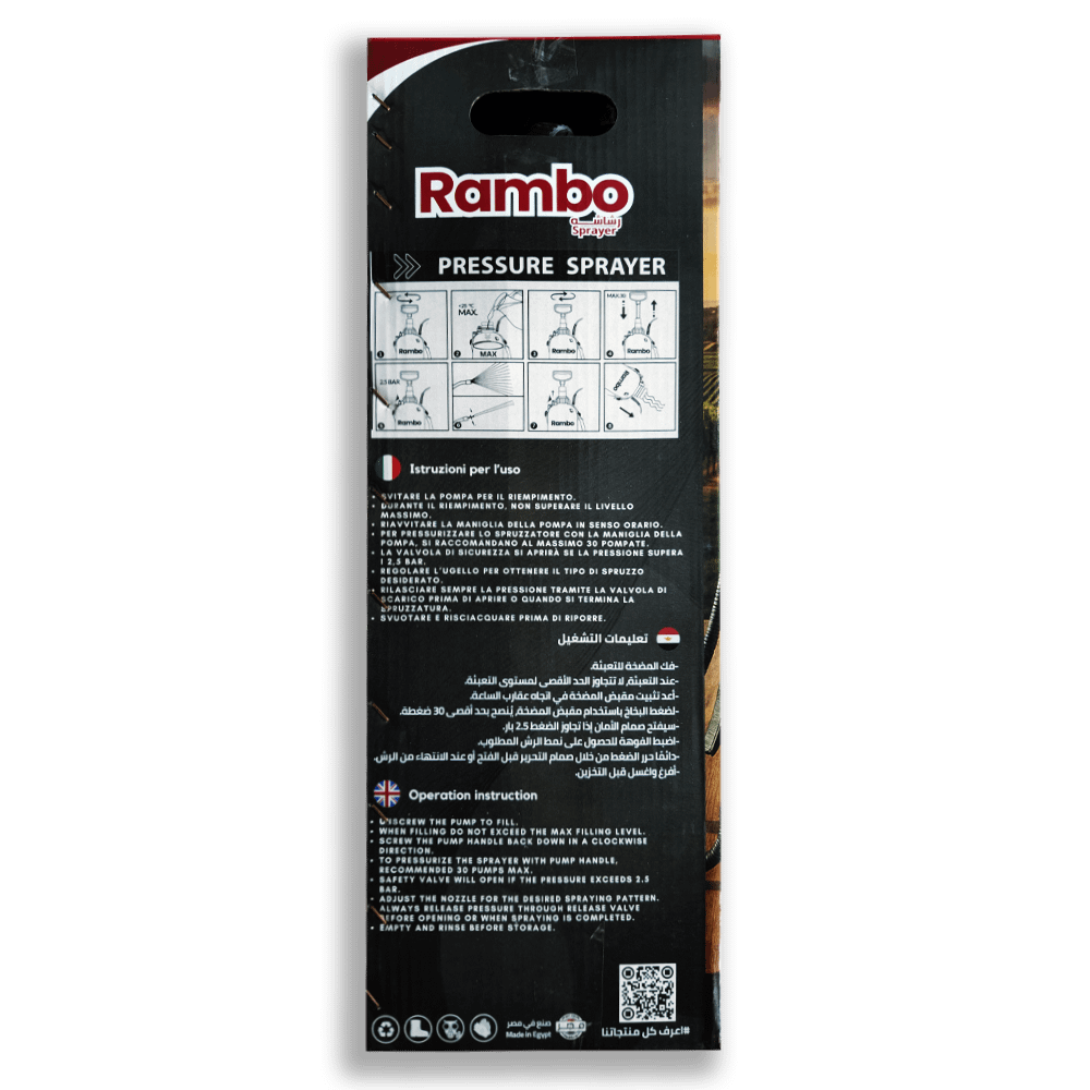 إذا كنت تبحث عن رشاش عالي الجودة يجمع بين الأداء الممتاز والمتانة الطويلة، فإن رشاش Rambo ـ 10 لتر هو الخيار الأمثل لك.