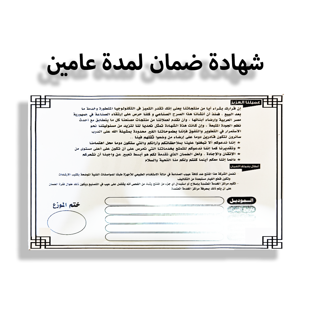 - مرفق معه شهادة ضمان من الشركة المصنعة لمدة عامين كاملين.