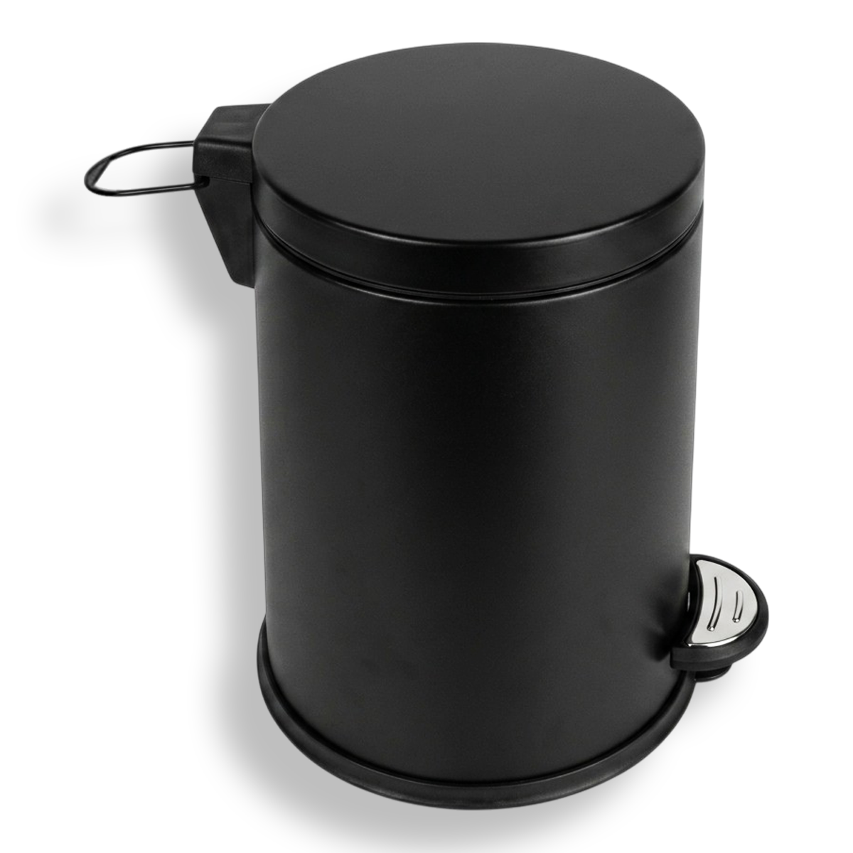 سلة مهملات سعة 5 لتر، تتميز بهيكل خارجي من الاستانلس ستيل عالي الجودة المقاوم للصدأ والبصمات، مع طلاء أسود مطفأ يعطي مظهراً فاخراً.
