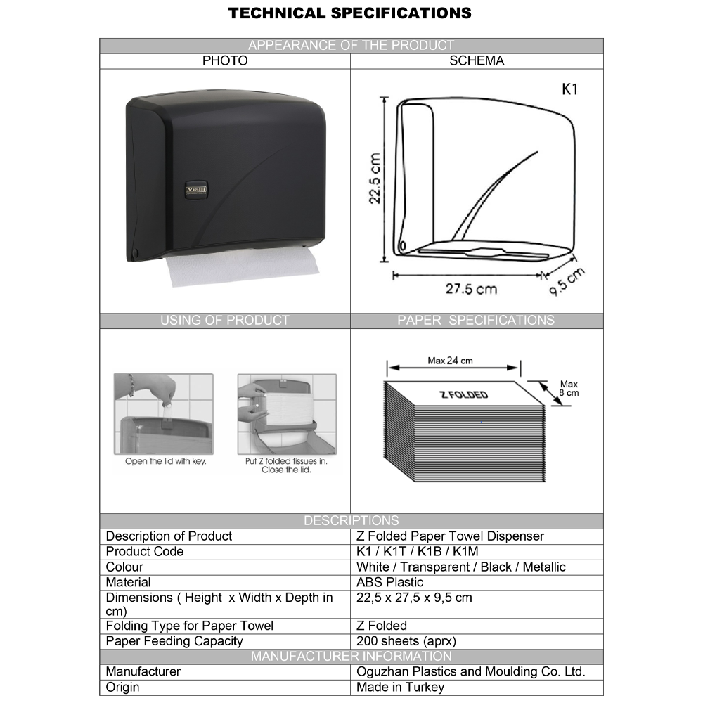 ارتقِ بمعايير النظافة في مساحتك مع موزع المناديل Vialli موديل K1B، المصنع في تركيا من بلاستيك ABS عالي الجودة والمقاوم للصدمات. يتميز هذا الموزع بتصميم عصري انسيابي يتوافق مع المناديل الورقية المطوية على شكل Z، مما يضمن سحب منديل واحد في كل مرة لتقليل الهدر بنسبة كبيرة.